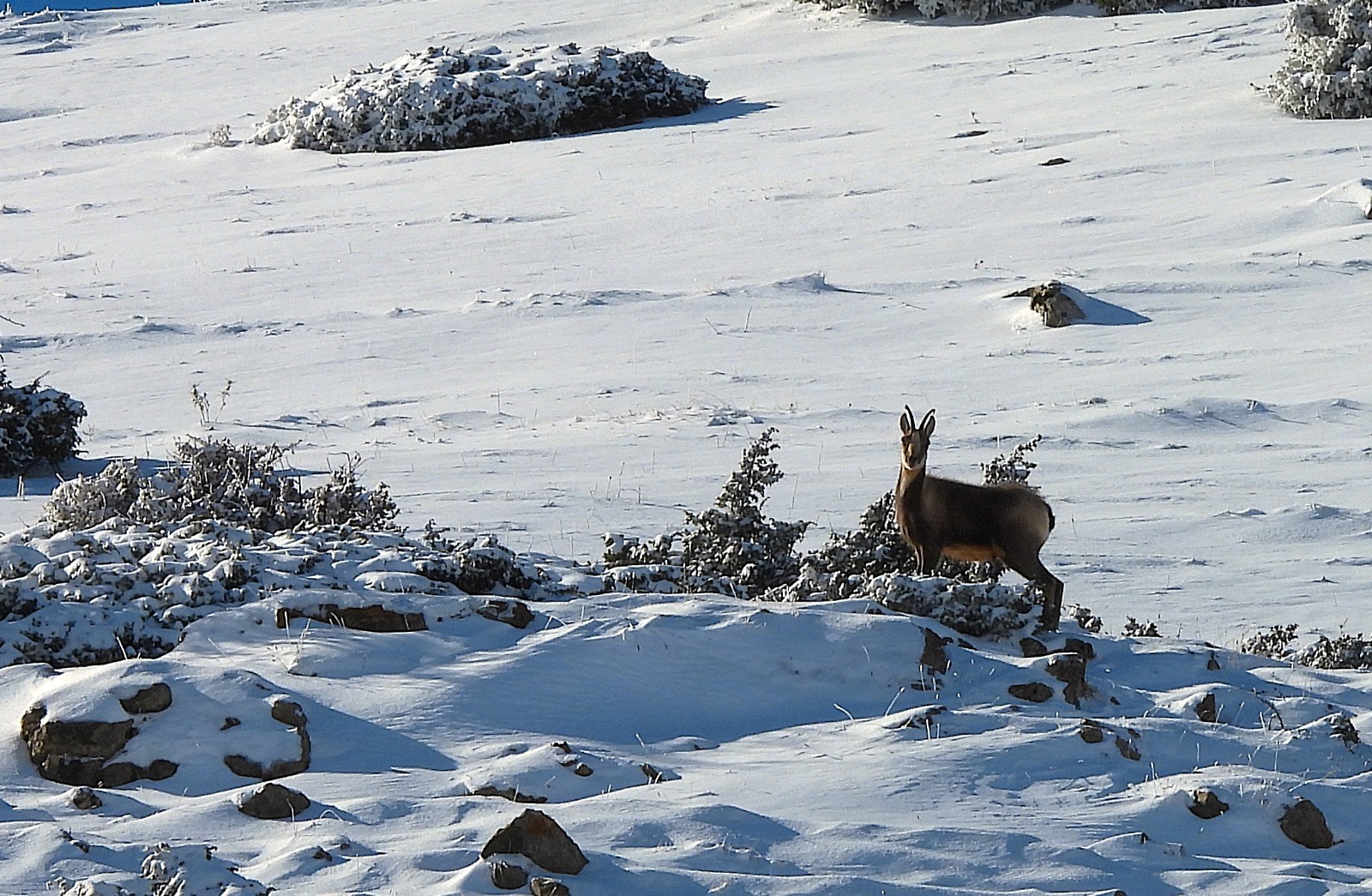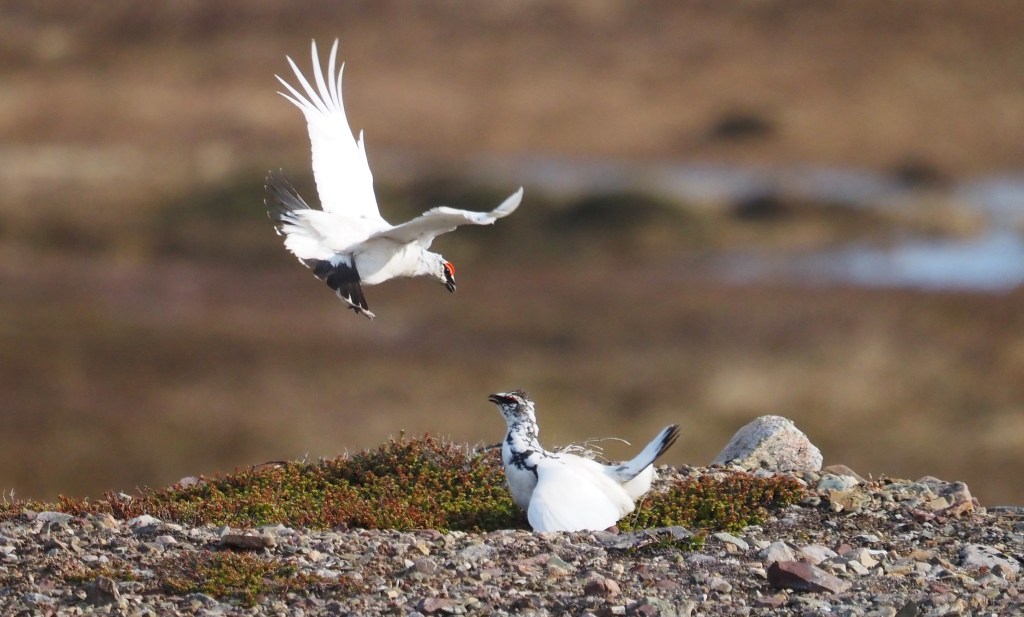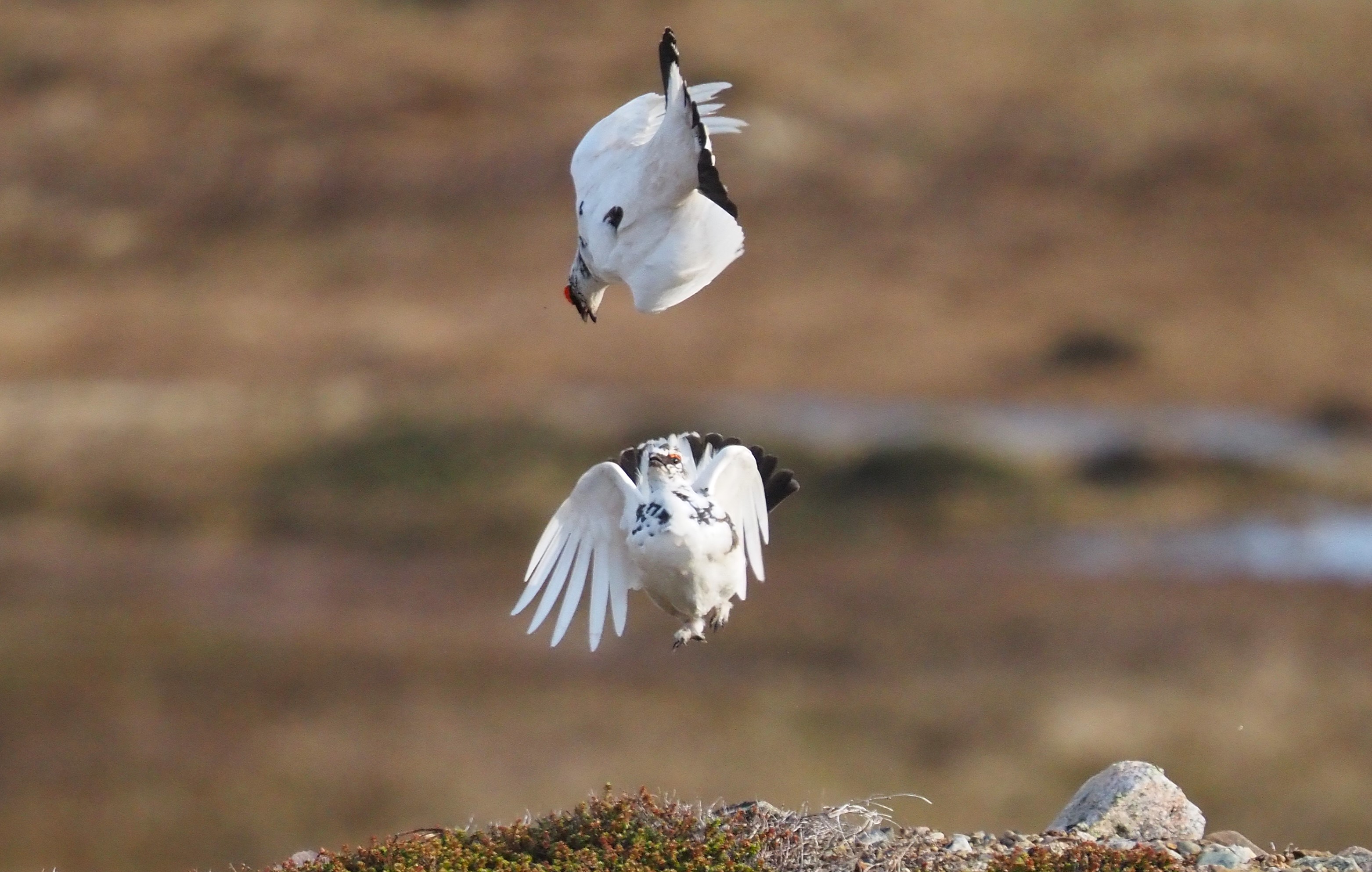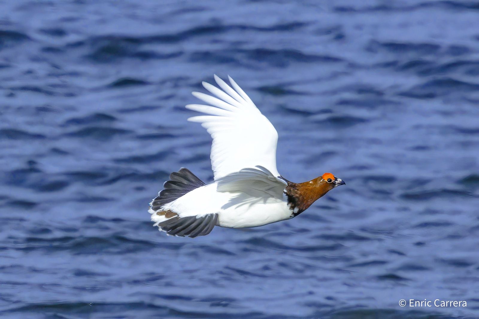La pluja i el fred s’intensifiquen però això no impedeix que seguim la ruta prevista quan des de la part de darrera de la furgoneta s’escolta “perdius!!”. Efectivament, una parella de perdius blanques restaven quietes al marge de la pista i després d’un curt vol les detectem a poca distància intentant assolir bones observacions. Tots dos exemplars s’alimenten tranquil·lament amb el mascle sempre alerta i marcant territori.