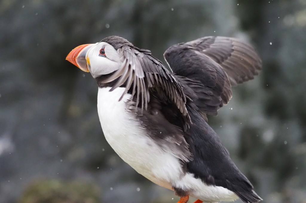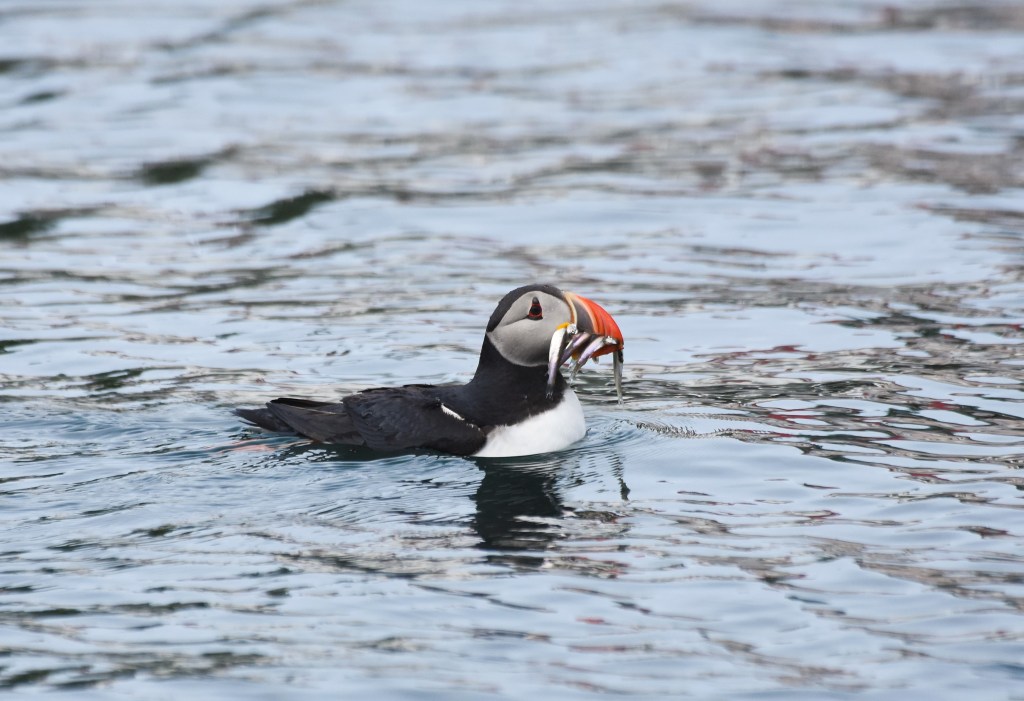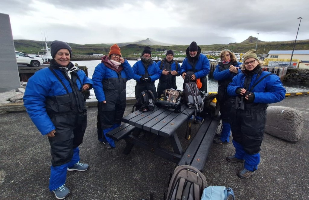 Una vegada ben equipats i disfressats, arrenca el vaixell cap a les aigües de la badia, acompanyats de grans estols de fulmars i diverses espècies de làrids. A més de diferents espècies de cetacis, a les zones riques en afloraments es veuen grans agrupacions de somorgollaires, frarets, gavots i amb el seu ràpid vol, diverses baldrigues pufins. Mirant amb detall aquests grups mixtos, acabem trobant alguna baldriga grisa i almenys una baldriga capnegre, ocell marí escàs en Islàndia el qual nidifica a l’hemisferi sud i que ara estan hivernant en aigües de l’hemisferi nord.