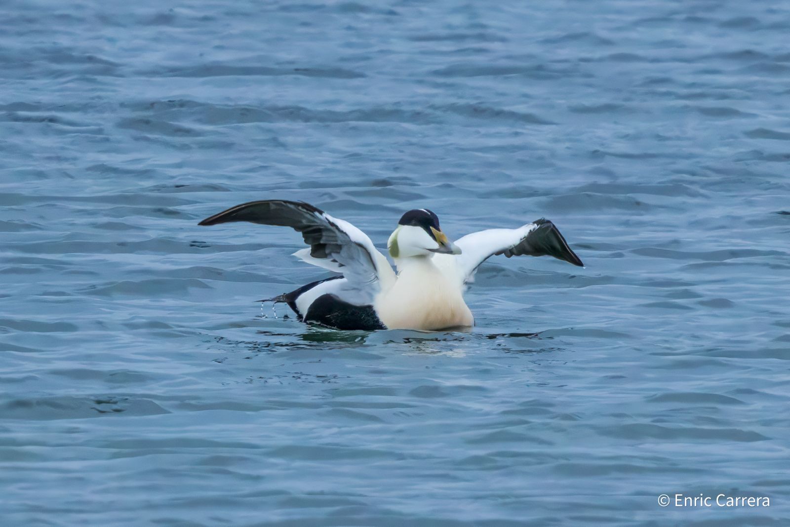 Finalment arribem al port de Borgarfjörður eystri o el dia abans s’havia vist un espectacular adult de calàbria de bec pàl·lid. Diversos ornitòlegs de variades procedències vàrem estar cercant aquest ocell però malauradament no va aparèixer. Tot i que es va veure aquell dia, però només a primera hora, marxant del port per no tornar. Però tampoc teníem temps per avorrir-nos. Aquí, refiats ànecs glacials, arlequins i grups familiars d’èiders, van fer-nos molt entretinguda l’espera.