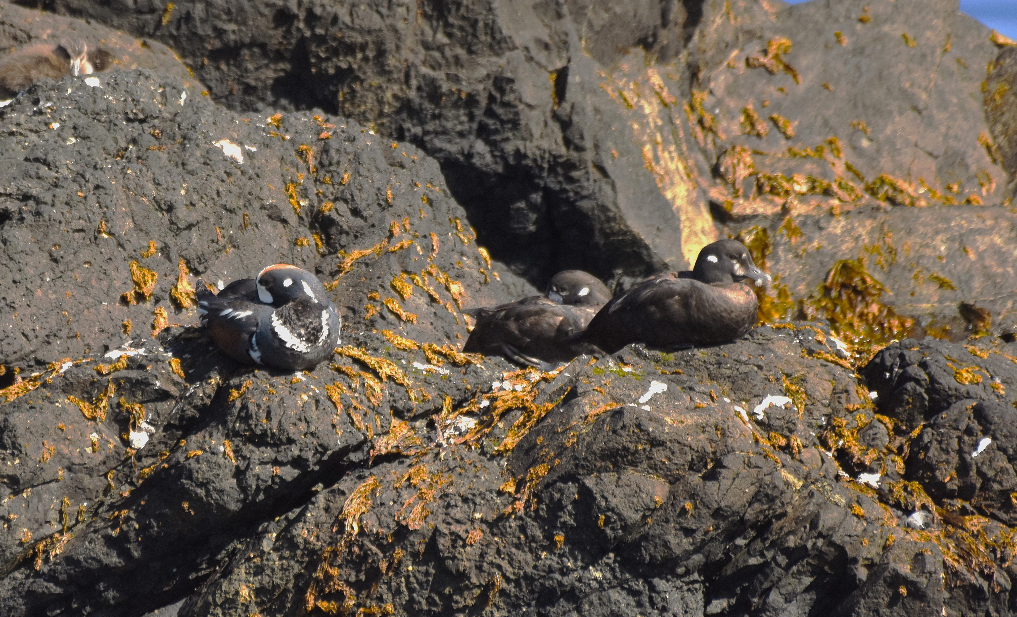 Però el dia encara no s’havia acabat, seguim cap el nord i tot visitant un petit torrent que desemboca al mar veiem un impressionant grup d’ànecs arlequins, majoritàriament mascles, els quals en aquestes dates ja han abandonat els rius on nien per anar a mudar al mar. Al mar es veu un continu pas de diverses aus marines i una llunyana cua de Iubarta. Cansats però molt satisfets iniciem la tornada cap l’hotel.