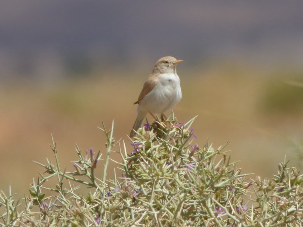 Herds of Dromedaires were grazing in the area, being a really nice setting of low scrubland in the desertic plain with tall mountains as a remarkable frame. Our walk was being not that productive as it was no trace of Scrub Warbler so we decided to go back to the minibus when suddenly something moved in front of. A bird skulking down with a long tail: Fulvous Babbler! Fastly we were all in the bird and we had wonderful views not in one but in 5 Fulvous Babblers moving on the ground and even going up in a bush to offer us a remarkable view of the birds!