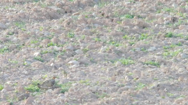 But we were confident so our first stop was in a corner were Sandgrouses use to feed in early morning. A first look to the area revealed no activity at all. Only 1 or 2 Calandra Larks were flying, almost no songs in the sky. A distant Red Kite was the most notiable… We moved slowly along the lane, carefully scanning the fields that were hurt by the wind. It took us a good while until we found the first Black–bellied Sandgrouse on the ground. A male. Did an effort to get the scopes out so everybody could enjoy despite the really strong wind. Some minutes later, a small flock of 5 Pin–tailed Sandgrouses moved from a nearby filed, coming closer to us. It took some time to put everybody in the birds as they mild so well even if it was so few grass! Our happiness was complete when we realised that there were also some Black–bellied Sandgrouses on the ground, only few metres away from the Pin–tailed’s!! So, at the end, we had both species together side by side, feeding, preening and enjoying the hard morning weather!
