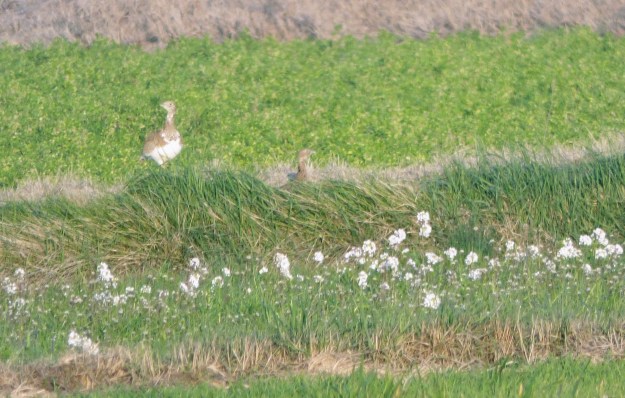In our second stop we were more lucky, and after some scanning we found 12 Little Bustards in a nearby field. They were hiding in a filed with tall vegetation and we could only count them after a long wait and search of the small neck appearing above the grass. While enjoying them, we got other good birds around including 1 Great White Egret, Grey Heron , Mistle Thrush and Zitting Cisticola.