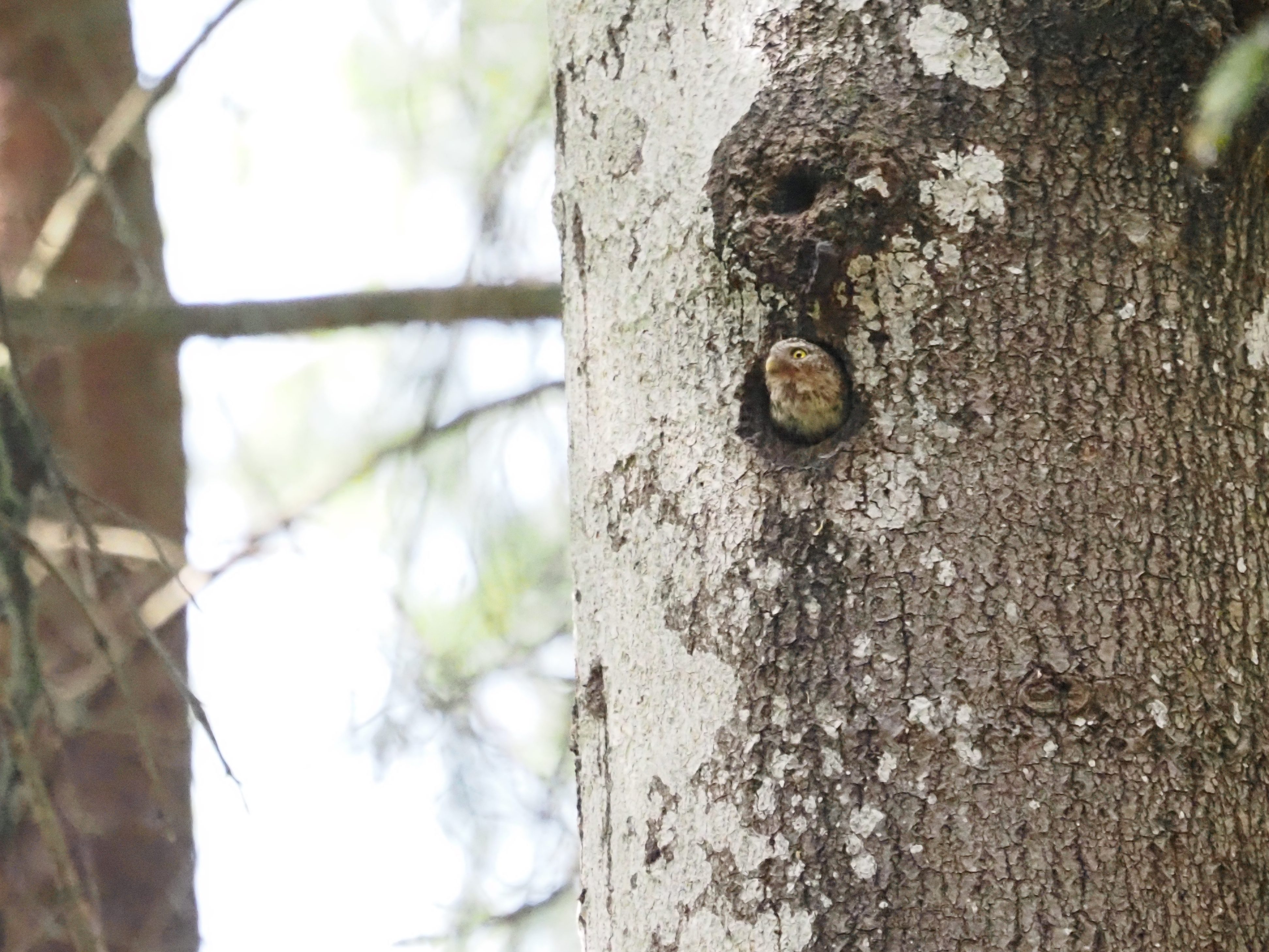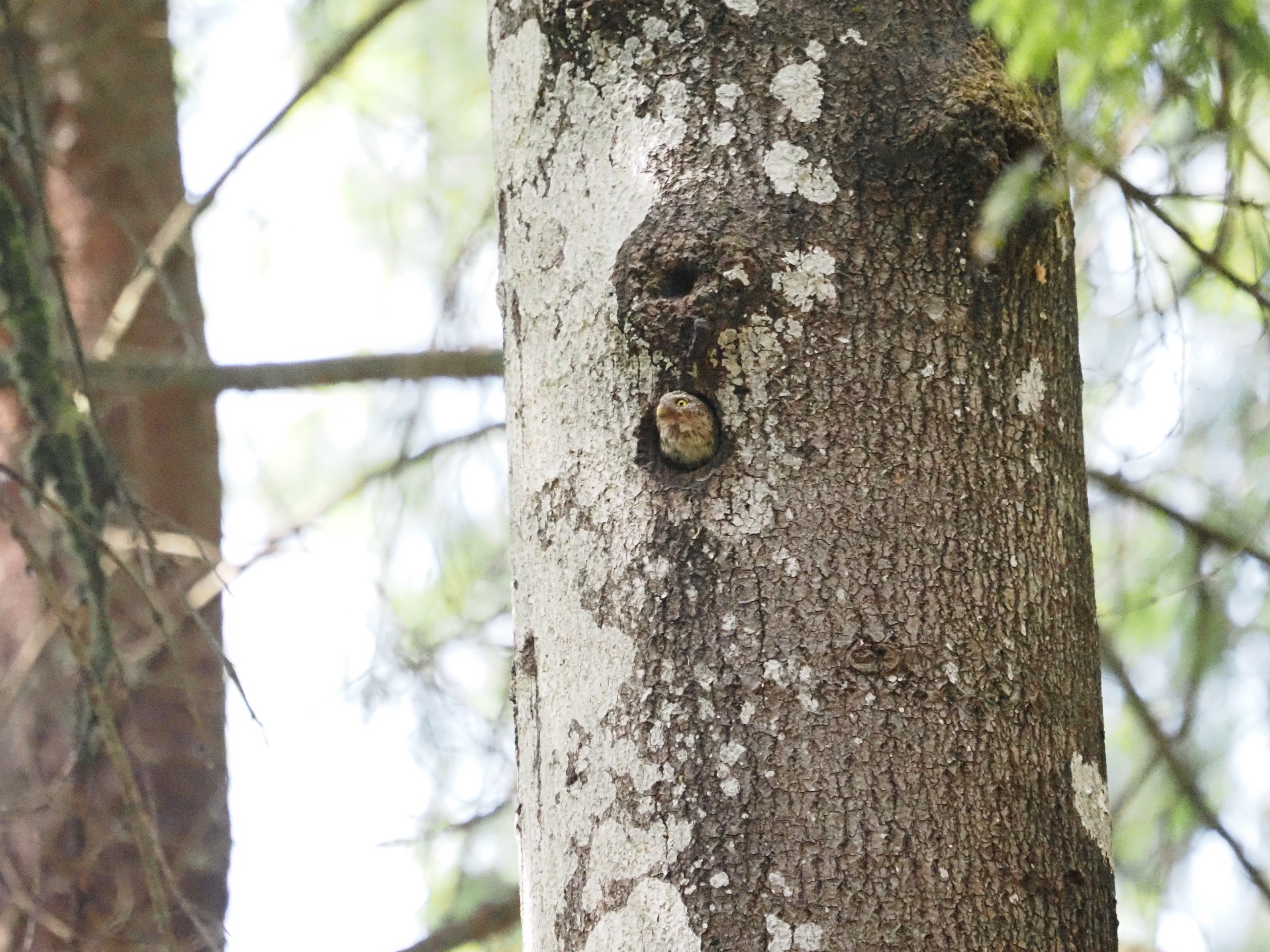 Eurasian Pygmy Owls have become quite common around Bialowieza, but they keep being difficult to spot. This time we were lucky, and at the moment of arrival the female was out of the nest, calling. Its calls were being answered by the male nearby in the trees, and after some waiting we saw the female leaving the nest, and joining the male in branch. The male was waiting for her with some food, and he fed her before she went back to its nest. This feeding scene didn’t go unnoticed by the several tits and goldcrests around, and they all tried, unsuccessfully, to disturb the pair of tiny owls.