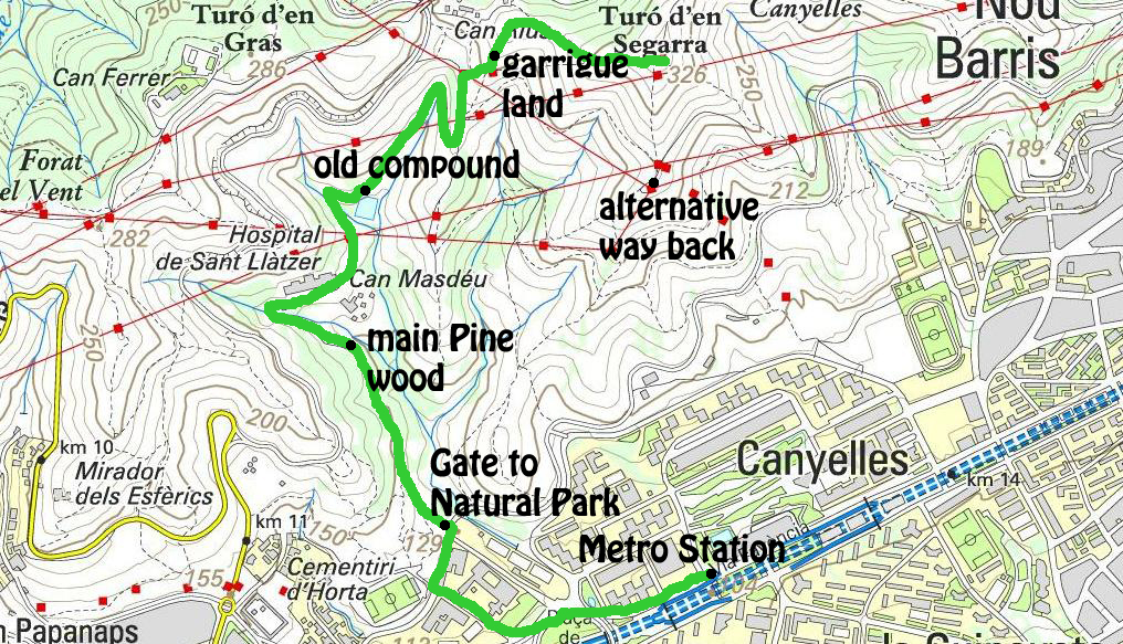 This itinerary cover a good variety of ecosystems in the recently formed Collserola Natural Park. From Canyelles metro station we have to walk West by Via Favència until Karl Marx Square. When walking around we can better have a look to the sky as Alpine Swifts (Apus melba) have an important colony in Canyelles neightborhood. Other birds that can appear in our walk are European Serin (Serinus serinus), Common Kestrel (Falco tinnunculus) and White Wagtail (Motacilla alba). From here we should walk towards the mountain by the small Camí Antic de Sant Llàtzer Street, immediatly left from a children Hospital. We careful not to get inside the Hospital facilities!