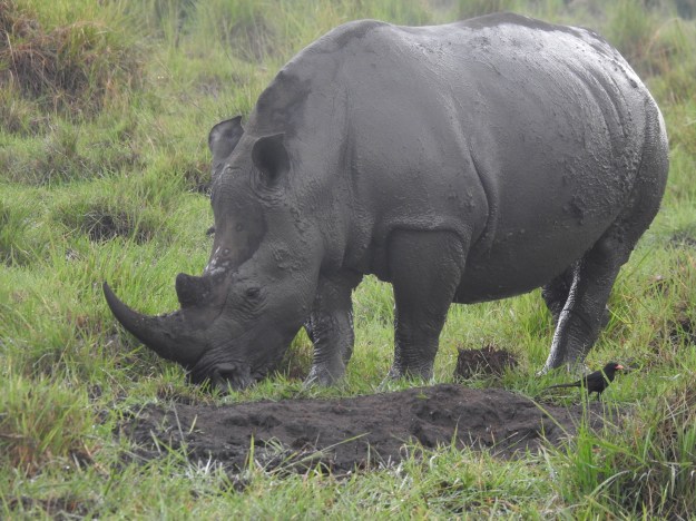 From here we went to a nearby restaurant for lunch and rest. After lunch we transfer North of Kampala, moving the Rhino Sanctuary, where we had a first contact with many of the birds leaving in the woodlands. Our arrival to this Sanctuary, devoted to protect an increase the thin population of this giant in Uganda, was precided by a strong storm. Once the rain passed away, we were scorted by a ranger to track some White Rhinos, and soon after we were enjoying of impressive views on 4 individuals feeding on the refreshing grass, and interacting nicely. At the same time that enjoying the Rhinos, we could move a bit in the bushland, and some birds were noted: Saddle-billed Stork, Hadada Ibis, Vinaceous Dove, Black-headed Gonolek, Grey Woodpecker, Northern Black Flycather and Bronze Mannikin were all noted. The short walk around produced also a Short-tailed Pipit, a really scarce species in the area, and a gorgeous White-headed Turaco that was feeding in the trees around. From here we just headed to our accommodation for a good dinner and rest.