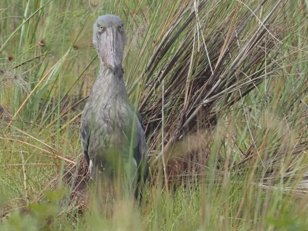 A Little Egret caught our attention for a few seconds, but we soon forgot about as a massive figure was revealed about 30 metres away from us. A grey-blueyish, statue-like massive bird with penetrating eyes made us forget about the world. A Shoebill Stork. No movements. No calls. Just the iconical, imposing figure with its massive, prehistorical-like bill. We enjoyed of this incredible bird for about 20 minutes, and during all this time the bird moved only a pair of steps.