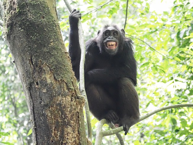 It was already mid-morning, so we started our way to the Southern banks of the Queen Elizabeth National Park. Before going, the group enjoyed really close looks on 1 Forest Hog feeding by the road! Our transfer to the South didn’t produce much, but a pair of stops in the way allowed us to connect with the first Cameroon Sombre Greenbul, Speckled Barbet & Dusky Tits of the trip, but also more chances to compare Little & White-rumped Swifts at close range. Still, the most wonderful moment of the stops along our way was when 3 Chimpanzees decided to cross the road right beside us while we having a break to eat something light.