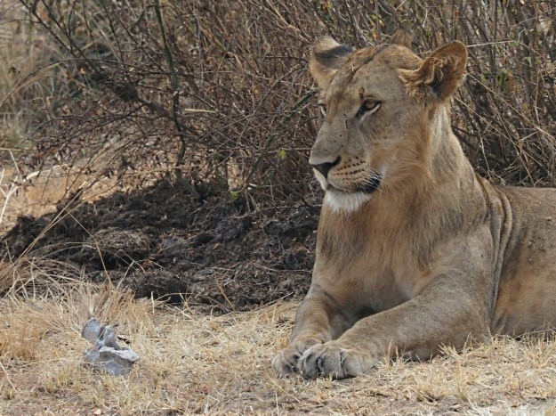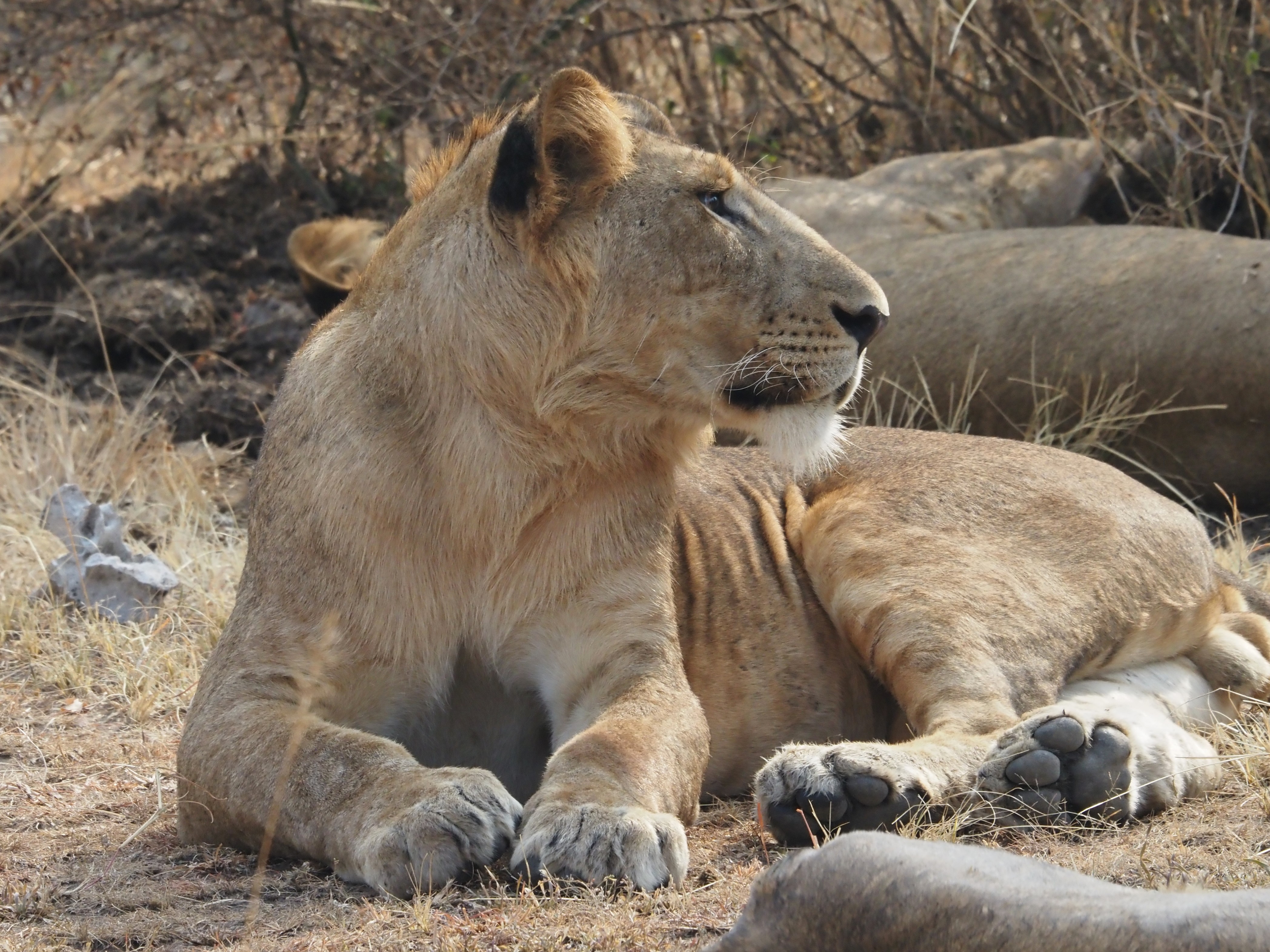 Endless herds of Uganda Kobs were covering the plains along with small packs of the very handsome Oribis. The slender silouhette of the Giraffes were also a common view in the park, and small herds of them were crossing here and there, sometimes not far from the much less common Hartebeest. It did’nt take us long before we located the first pack of Lions lying on the shade of the bushland. Two individuals, one of them a male, were out of the bushes and resting in the dry grass, providing a much better view.