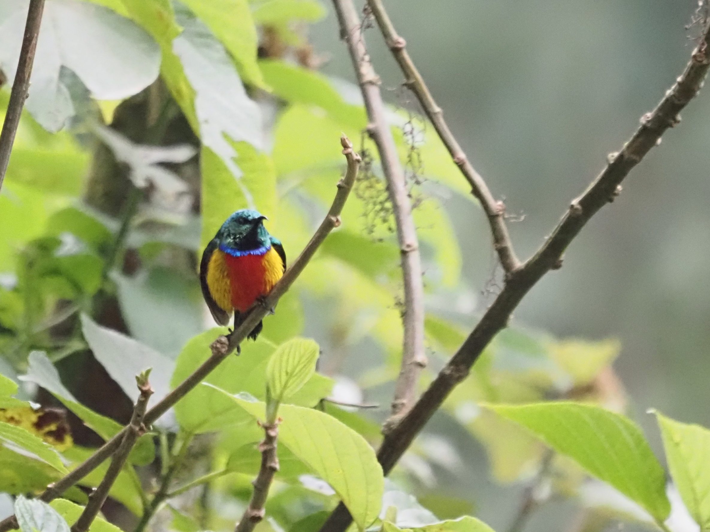 Early in the afternoon we were already in the Impenetrable Forest, and we had a pair of walks trying to find some of the goodies living there. We were lucky to find some endemics including Red-faced Woodland Warbler, Mountain Masked Apalis and an obliging Rwenzori Apalis, but the very best bird of these two stops was to find wonderful Black-faced Rufous Warbler, a species normally heard but not that easy to see! Extremely elusive, it took several minutes to get everyone to have at least some views in this impressive bird. A bit beyond, a Cassin’s Flycatcher was waiting for us in a river, its flauting song emerging from the crystalline water and spreading out into the jungle! A scoped Fine-banded Woopecker was also an excellent adding to our list, but was less celebrated than the Sharpe’s Starling that appeared right by the car!
