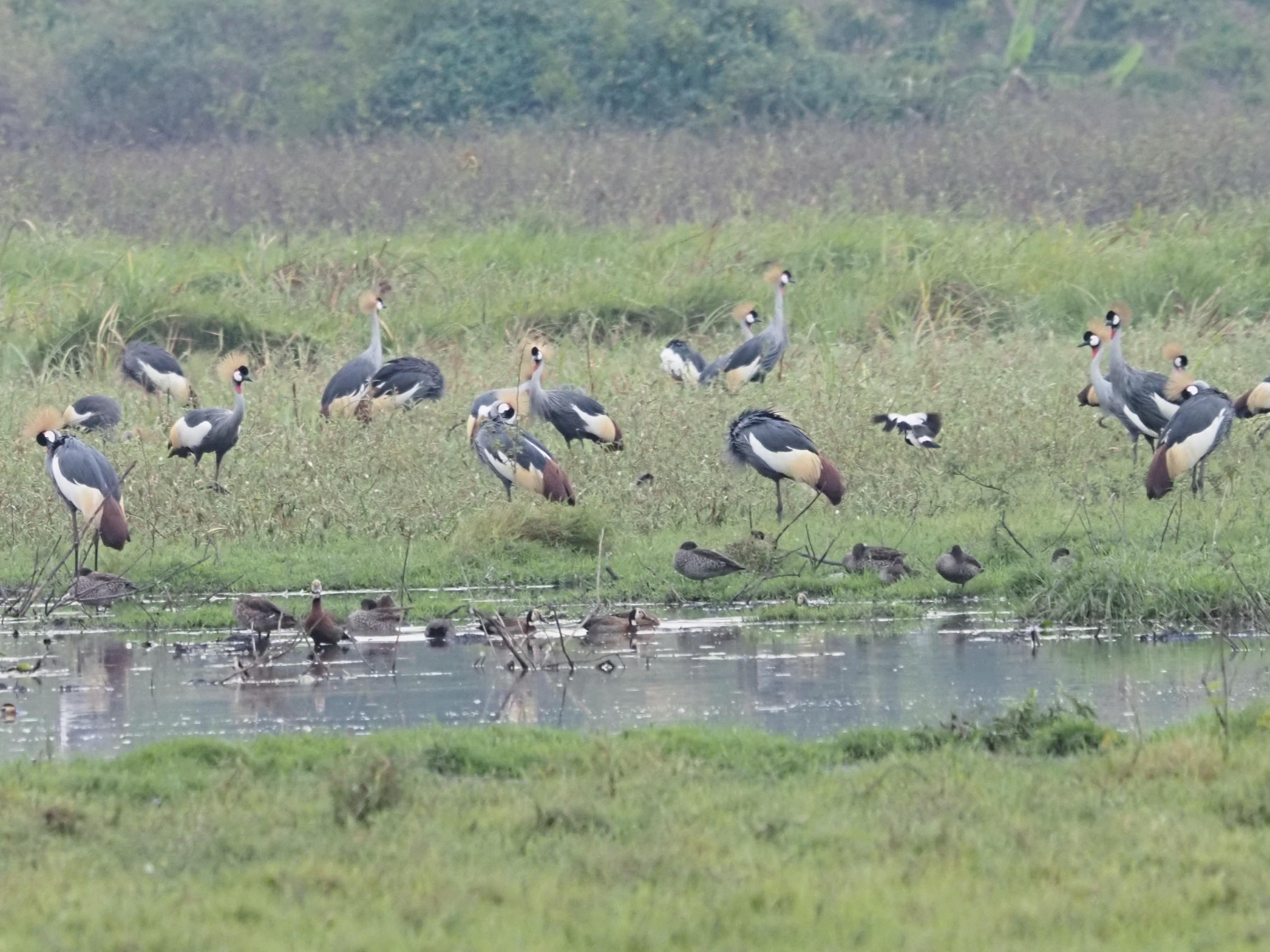 Moving North in the way to Entebbe, we had a stop in the __ Marshes, were we enjoyed the best wetland of trip. Here we enyojed large flocks of Grey-backed Cranes, Yellow-billed Storks, Yellow-billed Ducks, Long-toed Lapwings and White-faced Whistling Ducks along with 12 Hottentot Teals, several Black Egrets, and lovely views on at least 8 Rufous-bellied Herons. Other species noted in this wonderful corner included 5 Spur-winged Geese, Grassland (aka African) Pipits, White-browed Coucal, Fan-tailed Widowbird, Squacco Herons, African Swamphens and the only Three-banded Plovers of the trip.