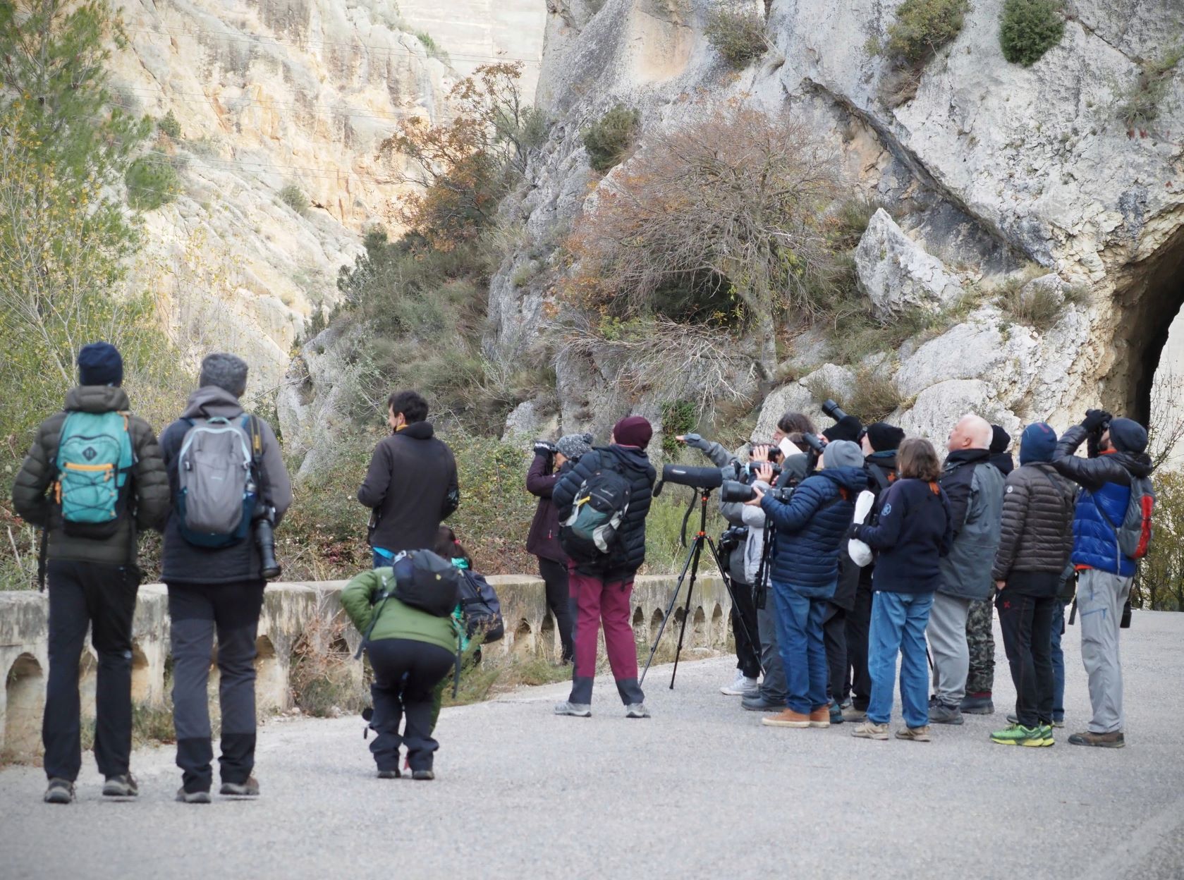 Collegats. Tothom fora i mirada a l’infinit. Voltors. Milans negres (Milvus migrans) en migració cap al Nord. Aufrany (Neophron percnopterus) contra els penya-segats. Bon dia maco! Algú veu un falcó peregrí (Falco peregrinus). Poc després un esparver vulgar (Accipiter nisus) remunta amb uns voltors. Una probable àguila daurada (Aquila chrysaetos) se’ns escapa per mil·lèsimes. Qui l’ha vist no pot confirmar. Com la trobarem a faltar! Llàstima! Mallarengues al nostre voltant. Res de l’altre món fins que un picot garser petit (Dendrocopos minor) tamborileja a tocar del grup. 1, 2, 3 vegades. Molt bé! No hi comptàvem. Marxem, que fem tard!