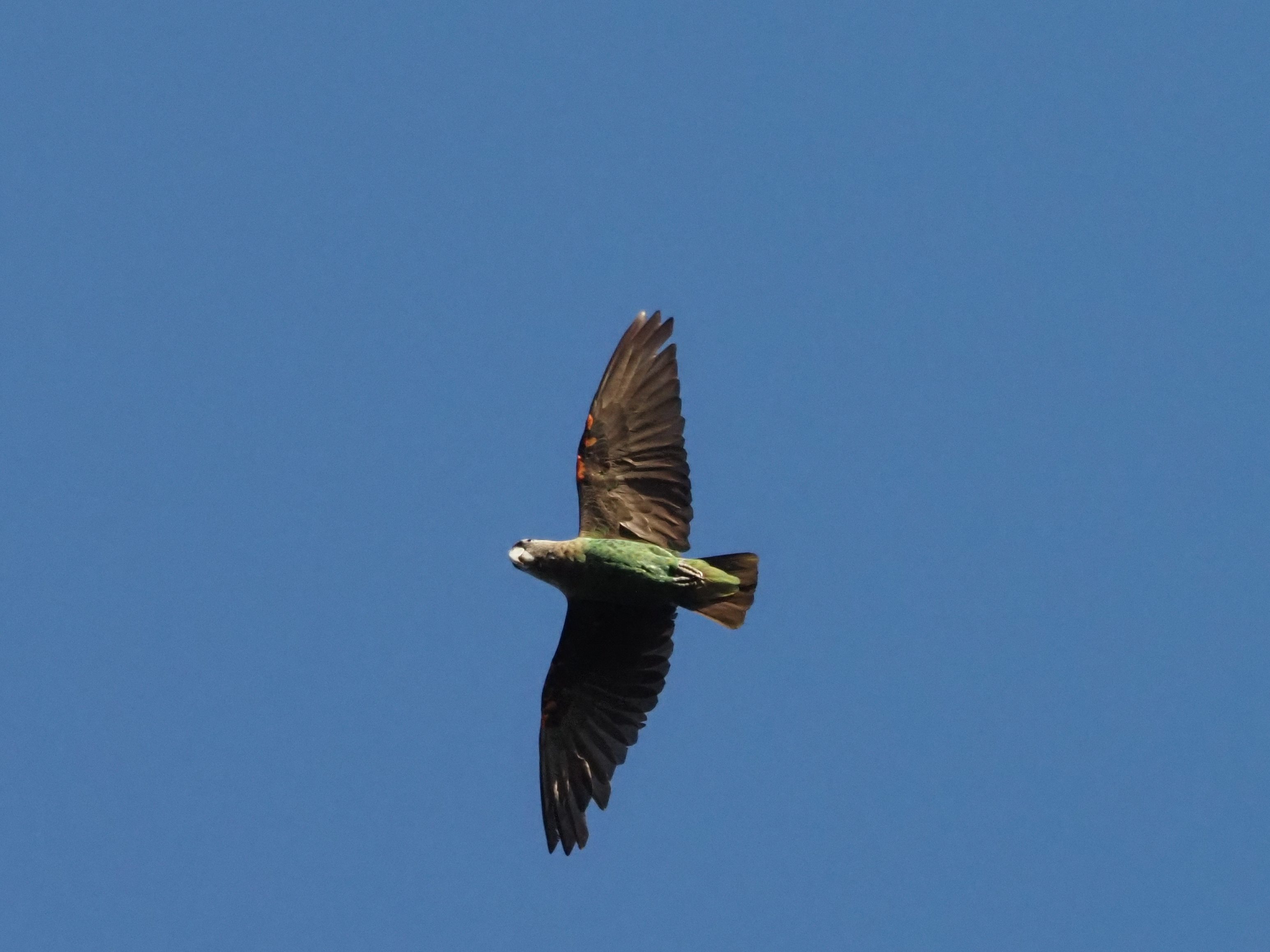 Day 2. First full day of birding of the trip. It was a sunny, warm morning in the hills around Magoebaskloof. As we headed out of our accommodation, a road stop was mandatory to enjoy some common birds including Cape Robin Chat, Forest Canary, Greater Striped Swallows, Dark-capped Warbler, African Stonechats and Swee Waxbills. It was a sunny morning and soon we were walking under the canopy of one of the few spots where the indigenous forests are still plentiful. Here we enjoyed up to 15 Cape Parrots flying, calling and feeding on some tall tress. Other good birds appearing here included Knysna Turaco, Steppe Buzzard and European Bee-eater. A short walk in the deepest of the jungle produced a very fine selection of forest specialties including Orange Ground Thrush, Narina Trogon, Square-tailed Drongo, and amazing views on Yellow-streaked Babbler along with other good birds such as White Cucckooshrike, Yellow-throated Woodland Warbler, White-starred Robin, Chorister Robin Chat, Barrett’s Warbler and an impressive African Sparrowhawk that was trying to pick up the breakfast in the forest.