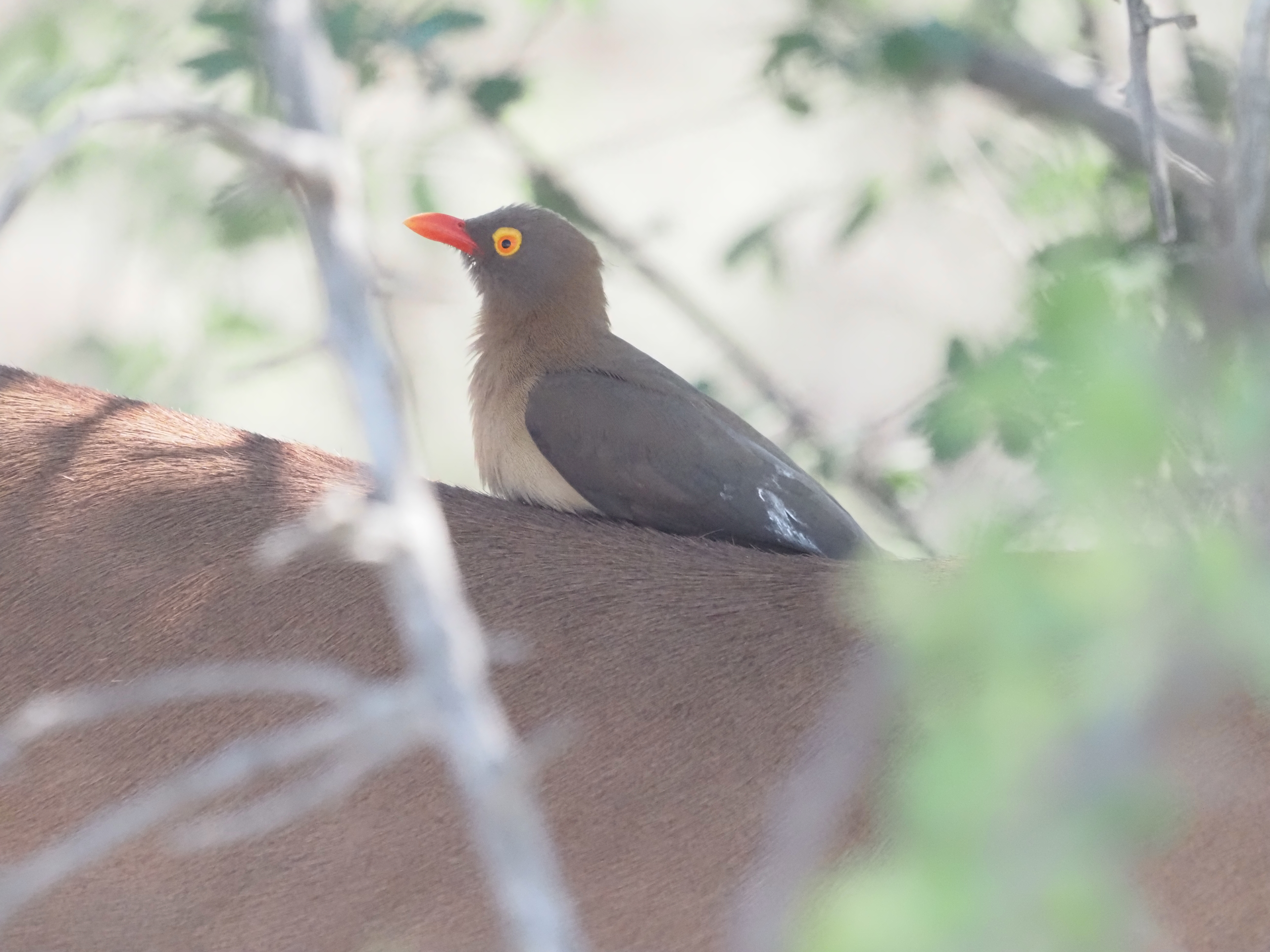 From here we just covered the short distance to our lodge. In they way, we were lucky to find the first White Rhinoceros of the trip, but unfortunately we only got great views on its but. Once in the lodge, we scanned for some birds, but the very low temperature made not possible and the only interesting bird seen was a Black-headed Oriole and a flock of Red-billed Oxpeckers coming to roost in a dead tree.