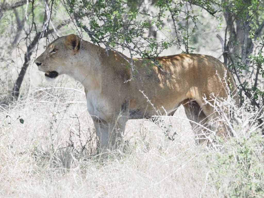While enjoying our generous brunch other interesting species appear including Black Stork, White-throated Robin Chat and a pair of African Hawk-Eagles circling. Our drive South extended still for a pair of hours, enjoying Red-necked Korhaan but also Waterbucks and Nyalas. But the longest stop was devoted to the first pride of Lions of the tour. This time, there at least 3 females and 4 cubs of different ages, so it was easy to guess that these females were in charge of all the cubs in the pride. As expected in the middle of the day, the Lions were not very active, but one of the females gave us a wonderful walk out of the shade.