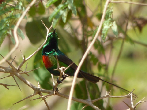 Here we were soon enjoying a long list of specialities. The area was fullfilled with Cinnamon-breasted Buntings (Emberiza tapahisi), small flocks of Rüppells Weaver (Ploceus galbula) and some African Silverbills (Eudice cantans). The firsts Palestine Sunbirds (Cynniris osea) were also seen feeding in the highest part of the fig trees while the whistles of Tristam’s Startlings (Onychognatus tristamii) announced the arrival of some of flocks of them.