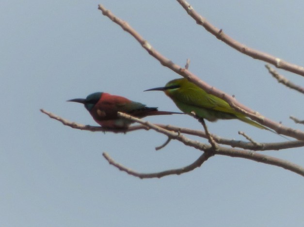 A short walk exploring the area produced a good number of other species. In the reedbeds and scrubs we got good views on Clamarous Reed Warbler (Acrocephalus stentoreus) and on a fast-moving Savi’s Warbler (Locustella luscinioides). The extensive canopies around had 2 abietinus-like Common Chiffchaffs (Phylloscopus collybita) and at least 1 Siberian Chiffchaff (Phylloscopus tristis) answering to the calls + a very vocal Red-breasted Flycatcher (Ficedula parva), and the first of a long list of Spotted Flycatchers (Muscicapa striata) along the tour. The channels around were full with Great White Egrets (Agrodietus albus) and Western Reef Egrets (Egretta gularis) + 2 Little Egrets (Egretta garzetta) and one 1st winter Purple Heron (Ardea purpurea). Small flocks of Arabian Green Bee-eaters (Merops cyanophrys) & Blue-cheeked Bee-eaters (Merops persicus).