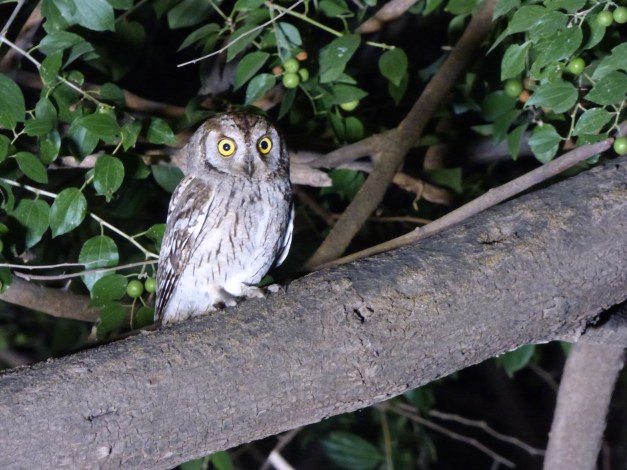 We arrived to the selected place just after dark. It didn’t take long before we heard some Arabian Scops Owls singing in the slopes. Here we also heard a Night Heron. After a couple of trials, we finally got close enough to one of them, and in a few minutes the whole group was enjoying amazing views on 1 Arabian Scops Owl. Not happy only with this we moved a bit into not a very promising place, but after a couple of minutes we could heard 1 Arabian Eagle Owl singing up in the slope. It took us some effort, but we finally got very nice scope views on Arabian Eagle Owl, singing its heart out while a second bird was replaying it at the other side of a small quarry-like place.