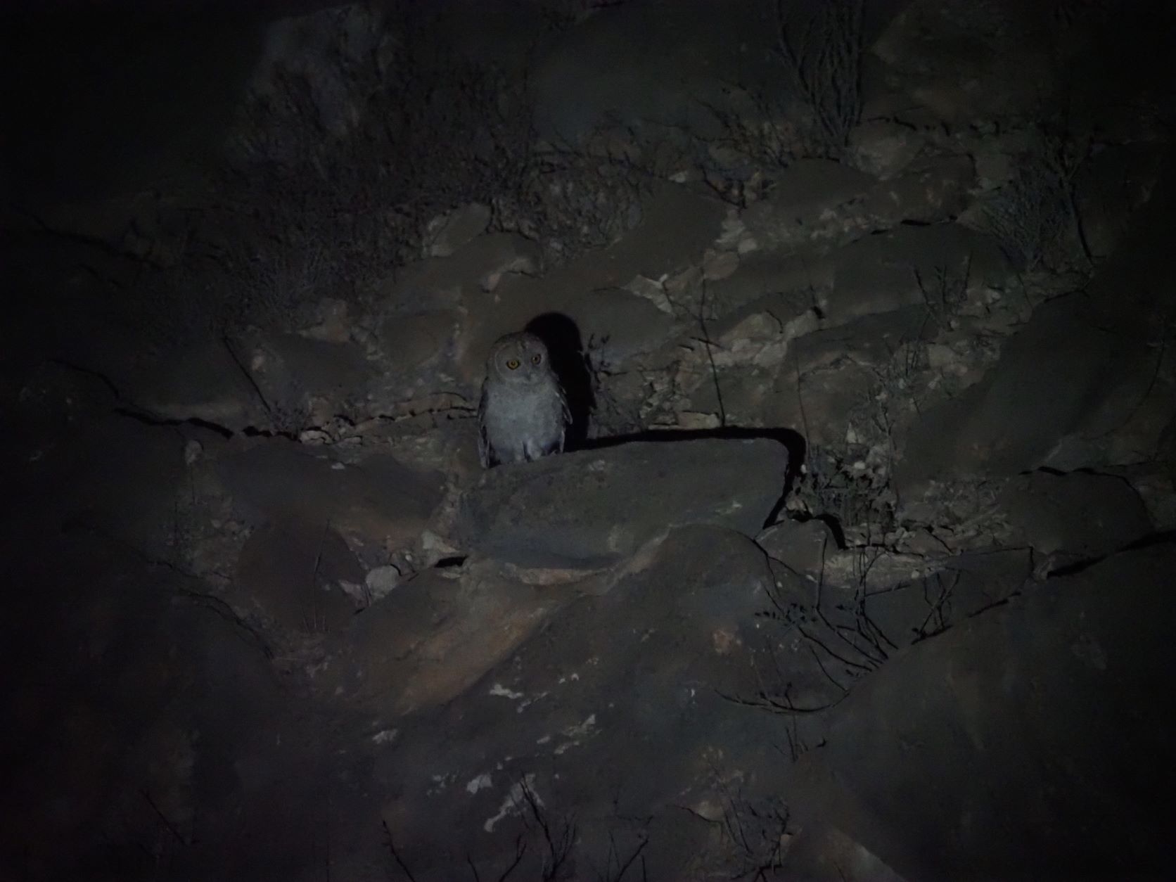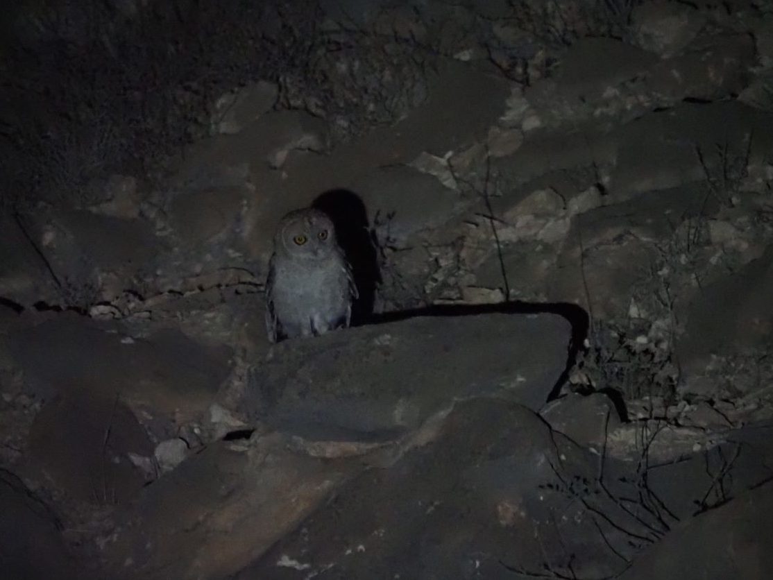 It was already dark and when we listened an Omani Owl singing at the opposite side of the gorge. We scanned long and at the end we found a medium size Owl perched in the rocks. Unfortunately it was very far and we couldn’t be certain.. Only a few minutes later an Owl flew over the group, and a couple of us had nice views on what it looked to be an Omani Owl!!