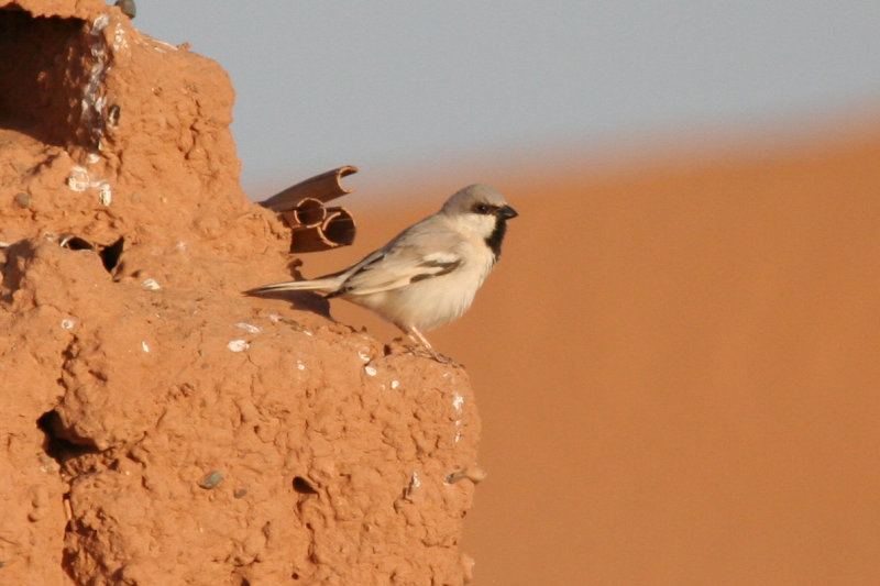 Once in the road we did some stops providing more Desert and Red-rumped Wheatears. After a pair of hours of drive we stopped in a dry river bed to look for Scrub Warbler. We hadn’t had to wait long until a gorgeous male was showing well. Singing from the top of some bush or feeding on ground around them. This is normally a really striking bird and it is sometimes not appearing when exploring the country by yourself or even in a bird trip. In the area was little movement so we came to the car as I wanted to stop in a place which is normally providing good birding on migratory passerines. We arrived there and it was really quiet. Flocks of House Sparrows were moving in the sandy palm tree orchad plus some Greenfinches here and there. There were only few birds moving in a tree just beside the path so we were there and spot 4 “Subalpine Warblers”, all of them males. Taxonomic treatment of this species has been changed in the very last years so it has been recently split into 3 different species (Western, Moltonii’s & Eastern). So, what it was my surprise to see in that bush a male having all patterns of Eastern Subalpine Warbler (Sylvia albistriata). Light grey upperparts and rump, evident, well defined and wide white moustache along with strong reddish throat and breast as well as white belly and vental area. A great and unexpected sight that we could see for some minutes before but, unfortunately could not take any image of the bird!! No other birds were moving around and the heat was quite strong so we came to the car to follow the road until our hotel in Merzouga were we could have some rest, some chating about the exciting birding in the morning and to prepare ourselves for a small afternoon trip to Merzouga’s lake. That lake, placed in right beside one of the limits of Moroccan Sahara, acts as an iman for thousands of migratory birds as a mandatory stop after crossing the endless desert. Our one hour long visit to the lagoon that afternoon produced a fine selection of ducks including >50 Ruddy Shelduck showing their beauty along the shore of the lake. There were also 5 Northern Shovelers, 10 Marbled Ducks (really endangered ducks), 1 Garganey and a wonderful flock of at least 15 Ferruginous Ducks!! Small groups of Red-knobbed Coots were also feeding across the lagoon. The lake also reported some waders. We had 1 Stone Curlew, 4 Kentish Plovers and 4 Ruffs along with several Black-winged Stilts, Redshanks and Common Ringed Plovers. At least 10 Gull-billed Terns were over flying the lagoon and the Great Crested Grebes diving in. And all of this with the sandy dunes around the lagoon reflecting their colour in the flocks of Greater Flamingoes!!! The desert around the lagoon reported also 1 Nightingale, 1 Northern Wheatear, 1 Woodchat Shrike and Desert Wheatears moving along with some Greater Short-toed Larks… After such a nice selection of birds we came back to hotel to have a nice dinner a some rest! Day 8. This was our full day in the desert to look for desert specialties, some of them quite scarce or elusive. After having a good breakfast our 4×4 was waiting for us out of the hotel. Our first stop was to look for the scarce Desert Sparrow. After a short wait in a incredible setting of dunes and palm trees we spot one male arriving to the top of a small construction along with House Sparrows. It was there for some minutes, preening and showing in the wonderful morning light.