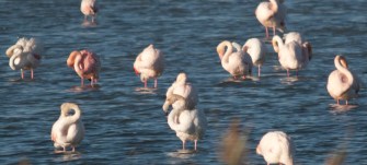 Once arrived to Ebro Delta we begun to see some of the common birds inside this huge wetland. Purple (Ardea purpurea) & Squacco Herons (Ardeola ralloides) can be here really common and despite the unnormal cold early spring most of them were already back from their African winter grounds. Along with them tens of Whiskered Terns (Chlidonias hybridus) and many Gull-billed Terns (Gelochelidon nilotica) were flying over the fields, looking for fish or crabs. Among the young rice plants, Black-winged Stilts (Himantopus himantopus) were also looking for food. After leaving our package in our new lodge we went to look for some Flamingoes (Phoenicopterus ruber). We found tens of them roosting in one of the many salt lakes in Ebro Delta.
