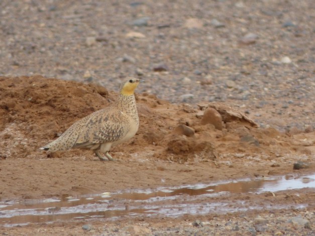Our first stop was around a water hole where we did stop to look for Sandgrouses coming to drink water from several kilometers away. We didn’t have to wait long since even before our arrival some flocks of Crowned Sandgrouses were already on the ground, waiting for the best moment to approach the water. After some waiting, we id enjoy several flocks of both Crowned and Spotted Sandgrouses coming to the plain around the small pond, and soon their calls and wing beats filled up the ambient. This was a wonderful moment, and all the tour participants were really happy to see 80+ Crowned & 40+ Spotted Sandgrouses coming to drink water! We left the area with still more Sandgrouses coming to drink water, but we had to move to our next stop, a nomadic camp nearby where a pair of Desert Sparrow was nesting.